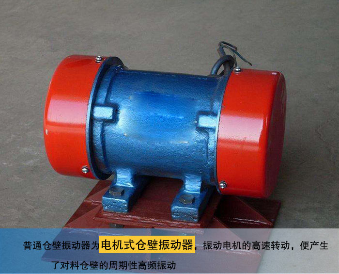 普通倉壁振動器為電機式倉壁振動器,振動電機的高速轉(zhuǎn)動,便產(chǎn)生了對料倉壁的周期性高頻振動,由于倉壁振動器裝置的周期性振動,一方面使物料與倉壁脫離接觸、消除物料與倉壁的摩擦,另一方面使物料受交變速度和加速度的影響,處于不穩(wěn)定狀態(tài),從而有效地克服物料的內(nèi)摩擦力和聚集力,以消除料倉內(nèi)物料間的相對穩(wěn)定性,使物料從料倉口順利排出。