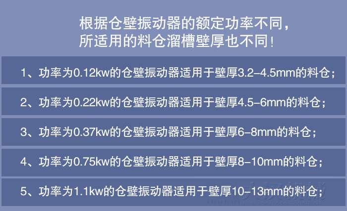 根據(jù)倉壁振動器的額定功率不同,所適用的料倉溜槽壁厚也不同!