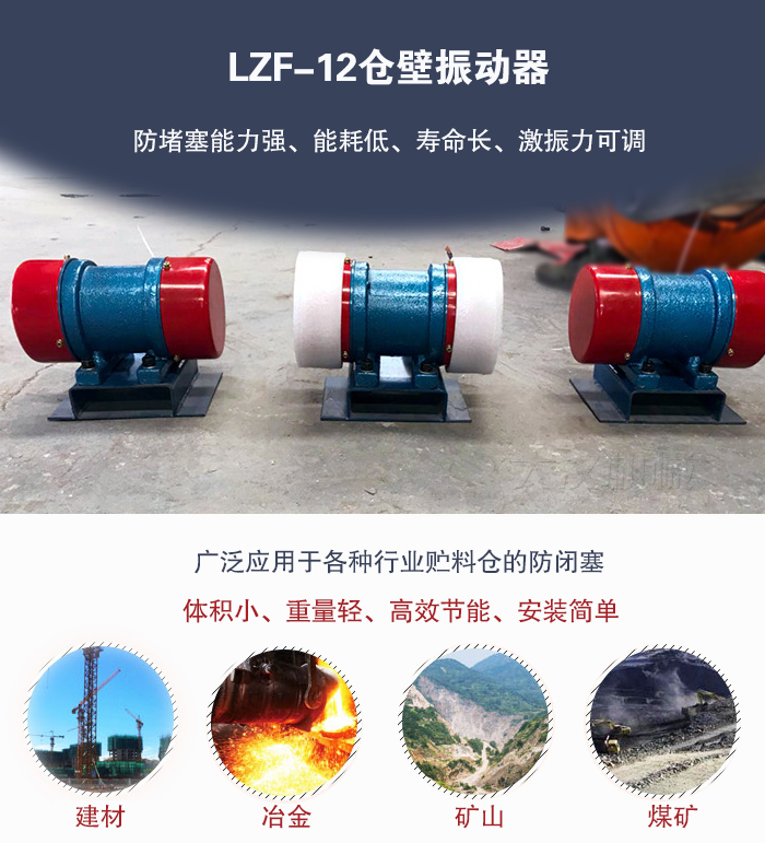 倉壁振動器由于具有結構簡單、防堵塞能力強、能耗低、壽命長、激振力可調等優(yōu)點,目前已廣泛應用于煤炭、電力、建材、煤炭、礦山、化工、冶金、鑄造、輕工、食品、制藥、糧食、交通等各種行業(yè)貯料倉的防閉塞之用。具有體積小、重量輕、高效、安裝簡單等特點。